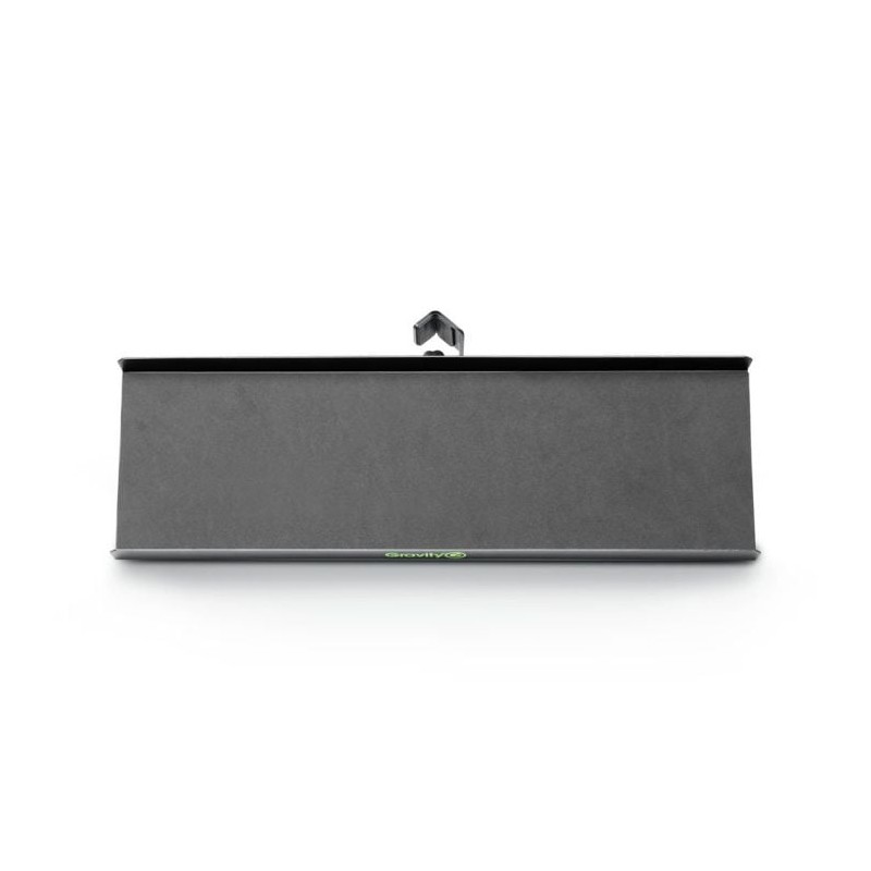 Gravity MA TRAY 2 è una superficie di appoggio in acciaio, orientabile a piacere, che può essere montata facilmente su qualsiasi asta microfonica. Con una superficie di 400 x 130 mm, è perfetta per strumenti a percussione come shaker o cembali e altri accessori.