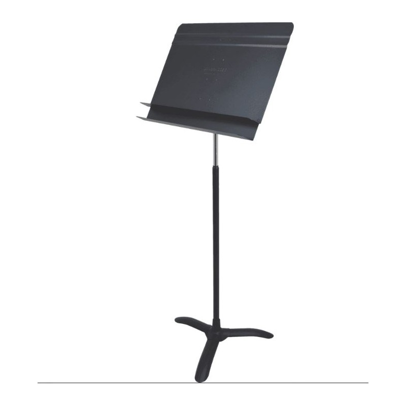 Il leggio Manhasset 5001 è progettato appositamente per orchestre. La doppia lingua di metallo sull'estremità inferiore della piastra crea un vano porta oggetti comodo per riporre l'arco, la colofonia, matite, ance, olio per valvole e altro.